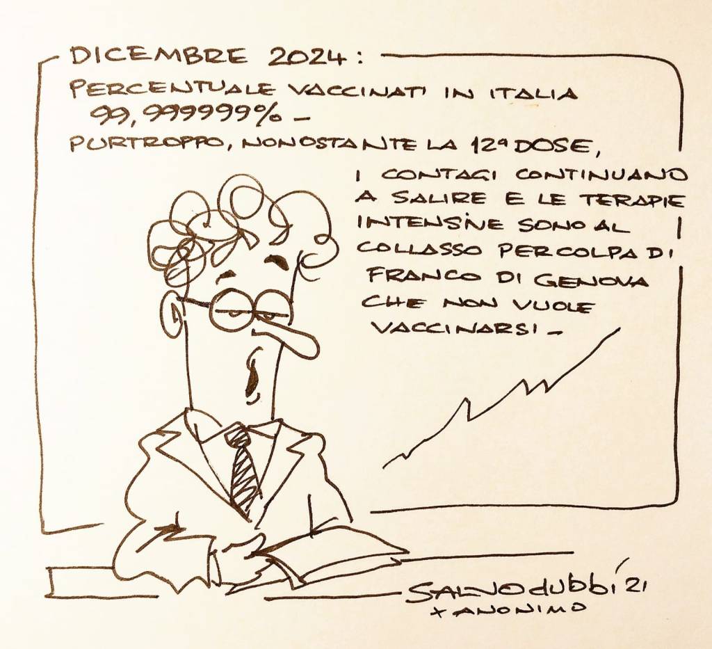 Eeehhh, ma non vedi che i contagi continuano a salire? Sì, continuano a salire, il che testimonia che la campagna vaccinale è fallita. Dovevamo farci il vaccino per tornare alla normalità. Per normalità tutti, dai giornali alle autorità, intendono zero contagi o comunque numeri contenuti. Ma se il vaccino non previene il contagio (tutt’al più tiene lontani dalle terapie intensive, e anche su questo ci sarebbe da ridire), vuol dire che alla normalità non ritorneremo mai. Si continua a puntare tutto su uno strumento che non è adatto allo scopo, e si nega che esistano delle cure per questo benedetto Covid. Col risultato che la gente non si cura, soprattutto se ha un medico di famiglia che dice “attendiamo”, e la malattia non curata, come è logico che sia, va a finir male. Il che è semplicemente criminale.