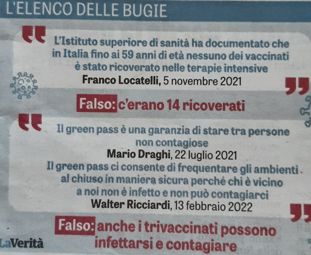 E adesso abbiamo anche un’ondata estiva, il che non era mai avvenuto prima dell’imposizione dei vax. Diretta conseguenza di una decisione sbagliata, o fatale nemesi per il governo Draghi e le sue bugie? Coerentemente con quanto accade nel nostro paese in questi giorni di luglio, alcuni studi già a gennaio ci informavano che i tridosati si infettano più facilmente dei no vax (si usa l’ossimoro “efficacia negativa”). Ma c’è chi nega tutto, a partire dall’Istituto Superiore di Sanità. Eppure risulta ormai impossibile credere a quanto sostenuto da Mario Draghi un anno fa, nella conferenza stampa del 22 luglio 2021, quando il presidente del Consiglio presentava il Green Pass come la “garanzia di ritrovarsi tra persone che non sono contagiose”. Ma come? Gli stessi produttori dei vax hanno sempre comunicato che i loro prodotti non impedivano il contagio. Gli italiani credettero a Super Mario? Allora fu proprio questa menzogna a generare la falsa sicurezza che ha fatto divampare i contagi. In un paese civile il sig. Draghi dovrebbe dimettersi di corsa. Altro che Boris Johnson!