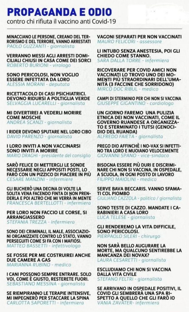 “No vax” è una comoda etichetta che serve per squalificare a priori chiunque contesti l’inoculazione di massa dei prodotti presentati come vaccini contro il Covid-19, cassando preventivamente le sue argomentazioni, senza entrare nel merito. E non è finita qui: nell’ultimo anno siamo arrivati all’emarginazione dei no vax, all’istigazione all’odio sociale contro di loro. Si ricorderà, Direttore, la valanga di insulti con cui ci hanno sommerso persino figure istituzionali, da medici come Burioni alla Regione Liguria (ne ho parlato qui).